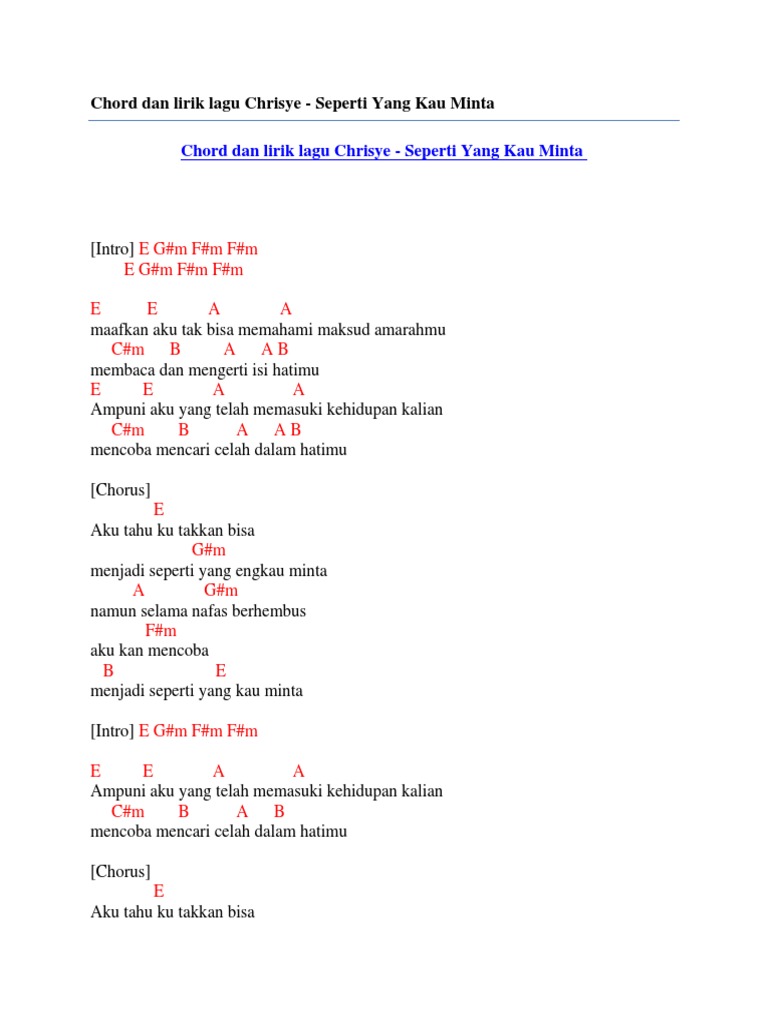 Lagu diorang pulak best jugak. Hati ini kan terus merindukan mu. Percayalah duhai kekasih ku G Ku tak bisa hidup tanpa dirimu F Maafkanlah mungkin semua salah ku Em Jangan engkau tinggalkan ku Am Cinta kita memang tak sempurna G Tapi ku yakin aku untuk selamanya F Ku berharap jangan kau lupakan aku Em Dihatiku cuma kamu Am Takkan pernah aku melupakan kamu G Takkan pernah ku duakan cinta mu.