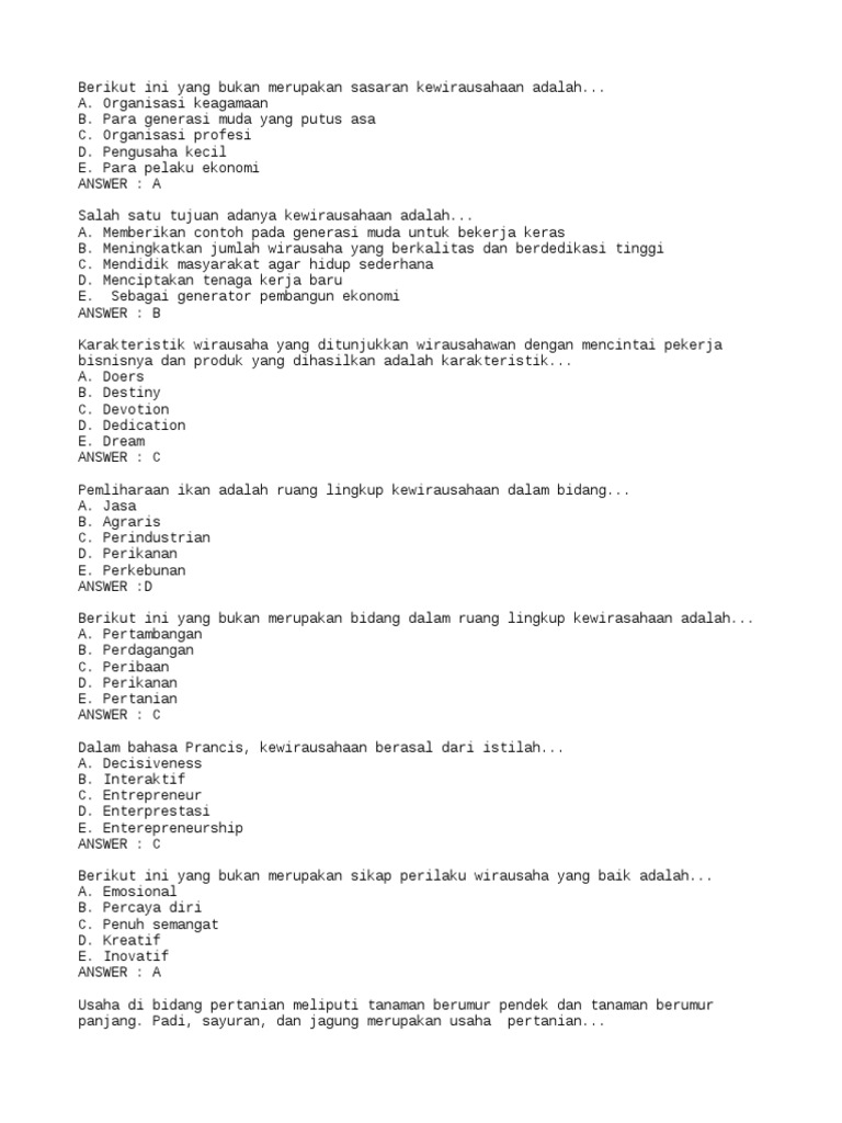 Berikut ini yang bukan merupakan sektor usaha formal adalah. Salah satu tujuan wirausaha adalah Menumbuhkan semangat sikap dan kemampuan perilaku. Yang bukan sifat dari wirausaha adalah apa saja.